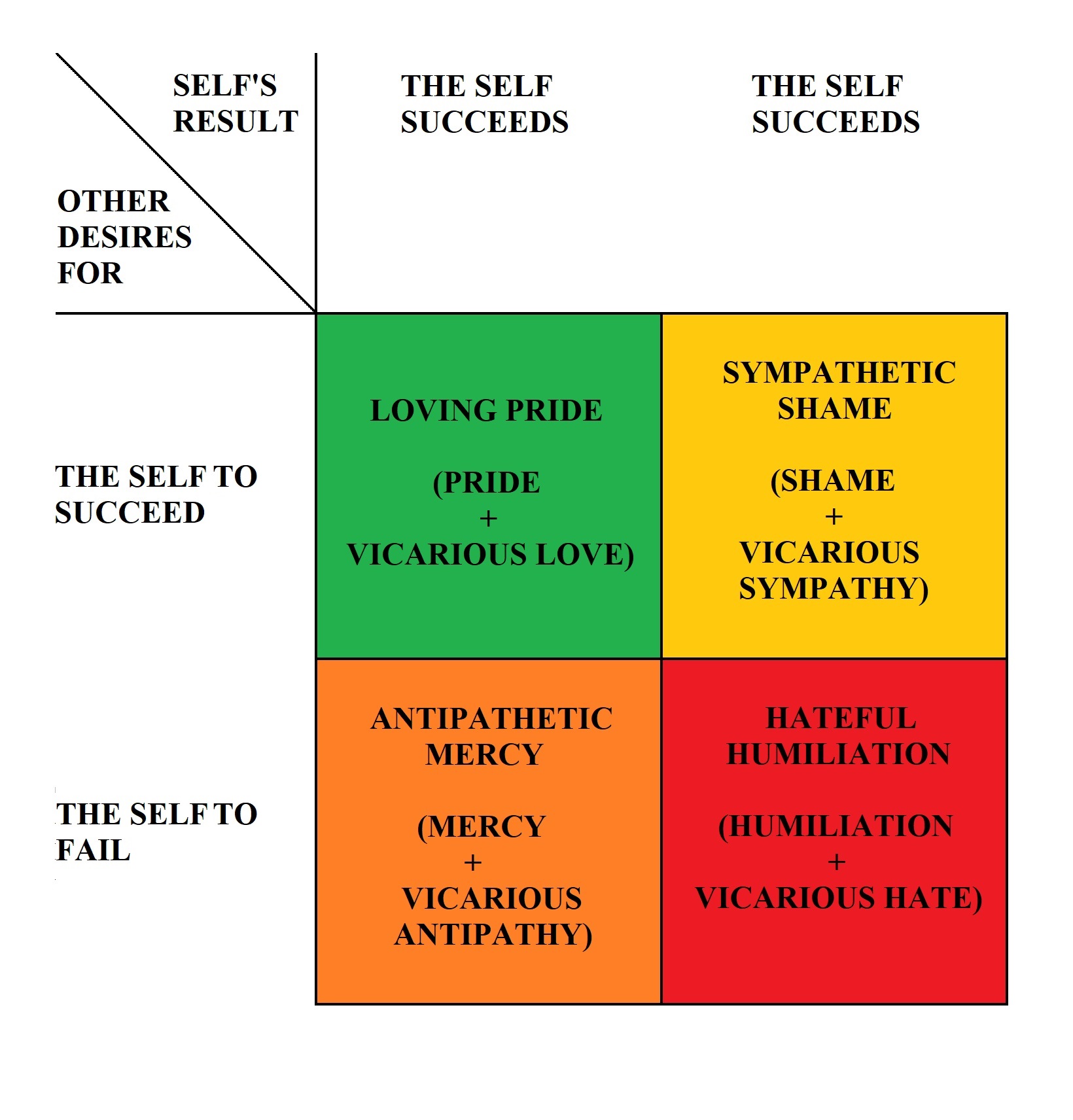 For the case of Sympathetic Shame, if the self were the passive party observing another and wanted a targeted other to succeed, but they failed, then the self would be modeled to feel Sympathy in Affect Engineering. Correspondingly, the targeted party, if they were aware that they were being empathized with, would feel Shame; shame, in this case, is more a sense of disappointment at having failed to achieve a goal that one desired to achieve coupled with the acknowledgment that others around expected or wanted the individual to achieve it. The self, in turn, would experience this sense of disappointment or Shame secondhand and vicariously in Affect Engineering’s framework, even if the self were the only one feeling Sympathy for the targeted party’s plight at having failed.