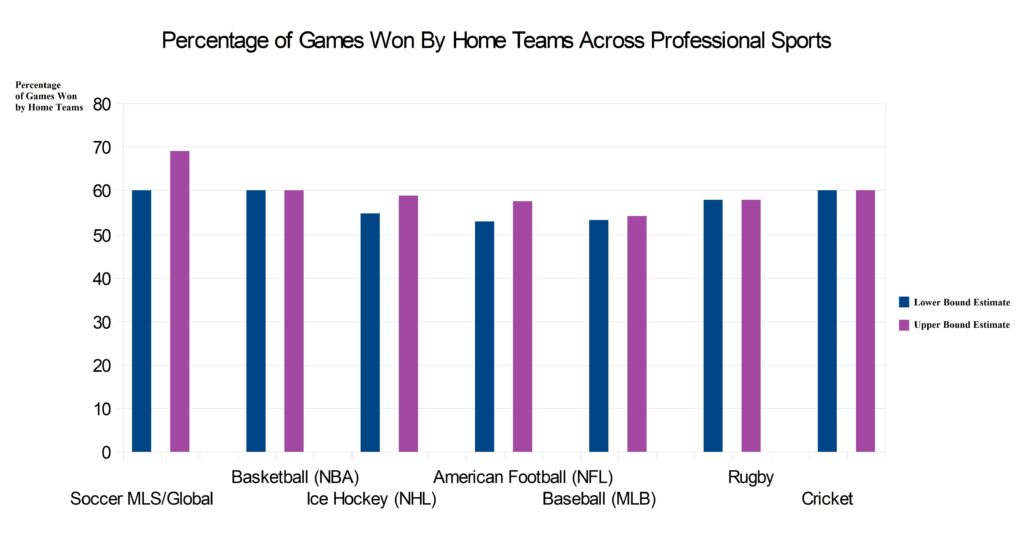 Across these professional sports, home teams win more games on average than away teams (Soccer ~60-69%, NBA ~60%, NHL ~55-59%, NFL ~53-57%, MLB ~53-54%, Rugby ~58%, Cricket ~60%). Other factors such as familiarity with the venue, having less jetlag from not traveling, and being acclimated to an environment (e.g., high altitude, snow, or heat in certain regions), also play a large part in home field advantage.