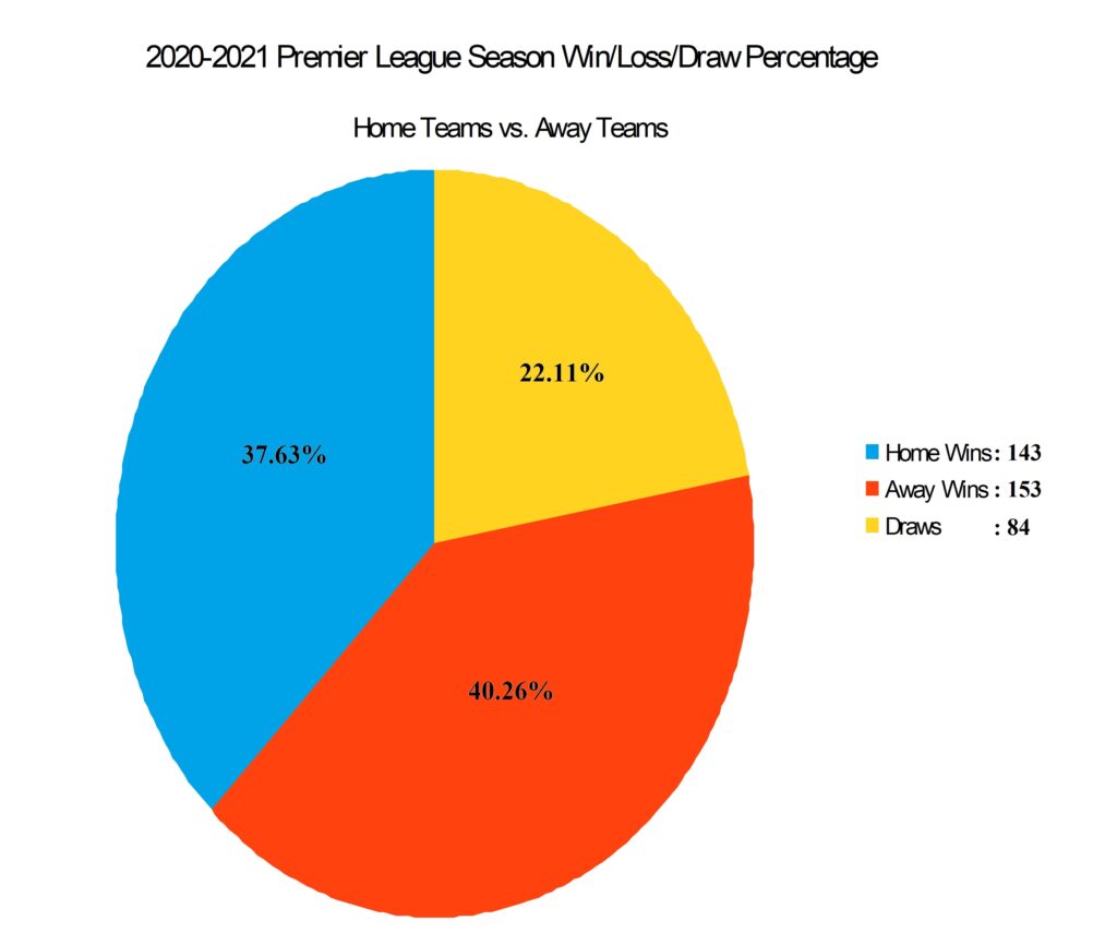 One exception to this home field advantage trend stands out among others. In its thirty three years and seasons of existence, the 2020-2021 season of the Premier League (soccer) is the only season that saw away teams win more games than home teams. This was also a season during which no fans were permitted in stadiums due to COVID-19 restrictions. It saw away teams win 40.3% of games against home teams, who won 37.9% of games.