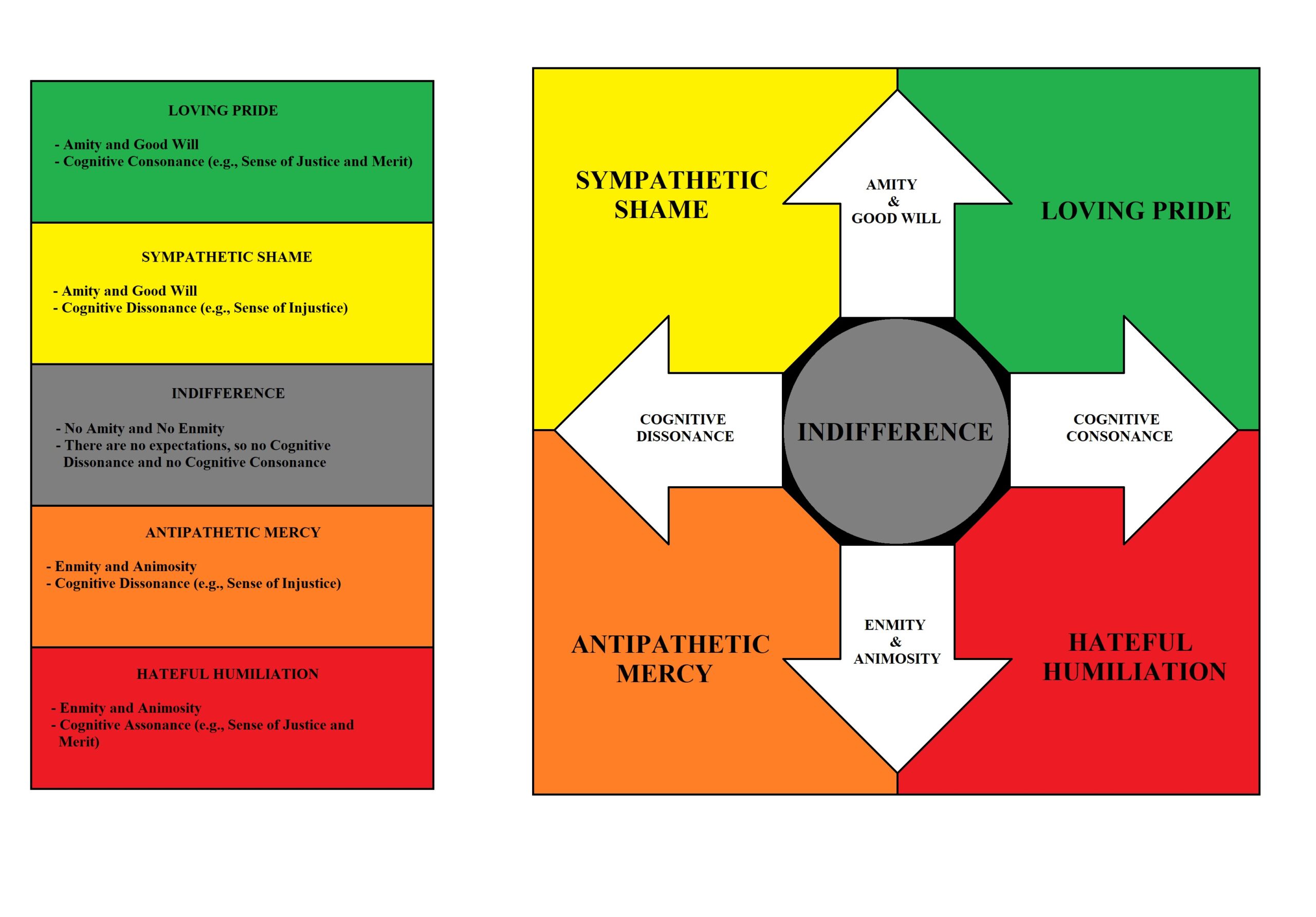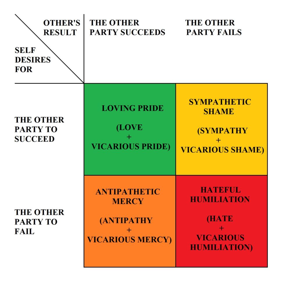 Category II Emotions are organized into two separate, but related, groups. Love, Sympathy, Hate, Antipathy, and Neutrality are felt by the passive party that is observing the active party. The passive party imagines themself as the target and desires to vicariously experience the target’s success (for Love and Sympathy), or their failure (for Hate and Antipathy), or neither (for Neutrality).