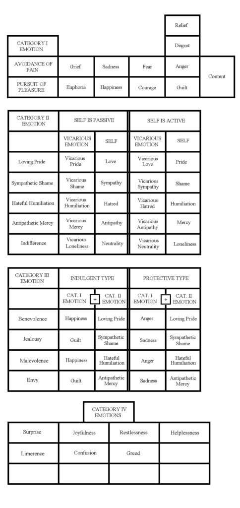 Empathy, or the self imagining itself experiencing a situation as another party, is present in all Category II, all Category III Emotions, and in some Category IV Emotions. In the case of Category II Emotions, the self’s vicarious experience is purely passive, akin to watching a movie and identifying with one of the characters in it. In the case of Category III Emotions, the self is actively attempting to influence the outcome of the situation for the another while also vicariously experiencing the other’s success or failure.