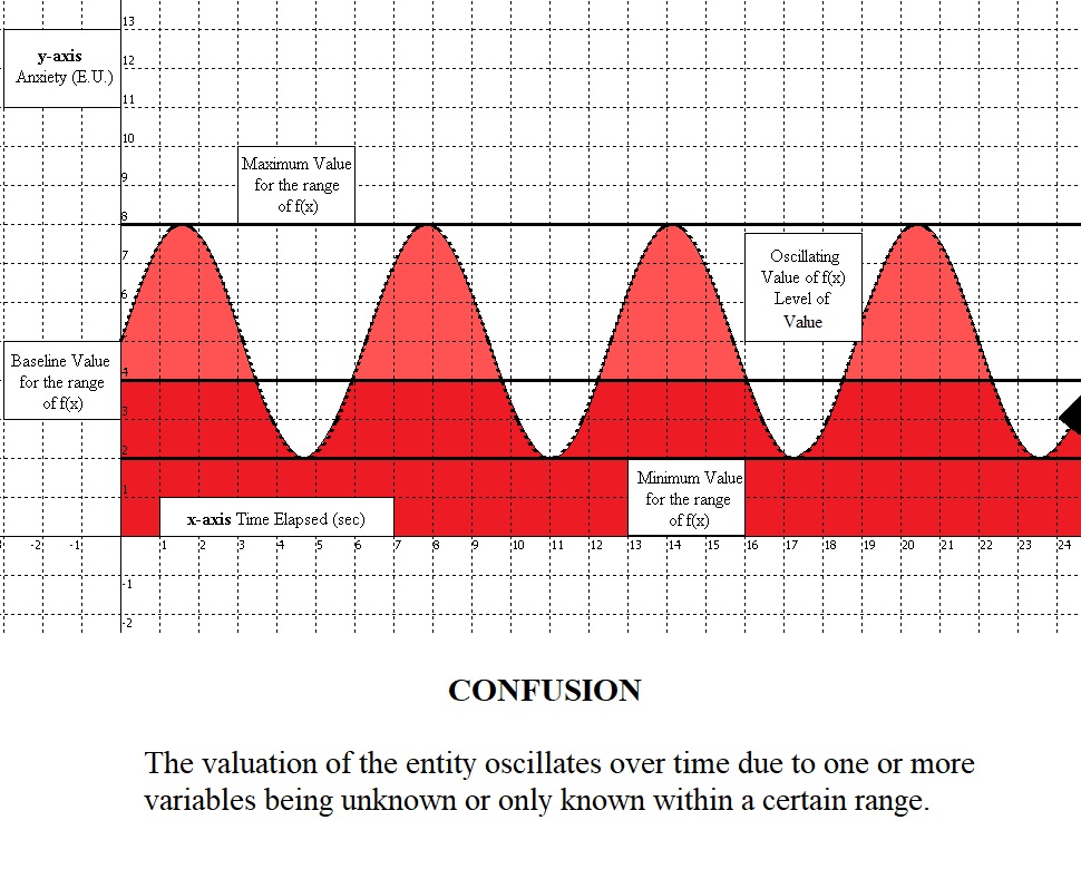 Confusion felt by the self for an entity is characterized by one or more variables in the function being unknown, only known within a certain range, or varying unpredictably from one instance to another. The valuation of the entity for a specific purpose might oscillate within whatever range is possible based on what is known or suspected with the given information the individual knows.