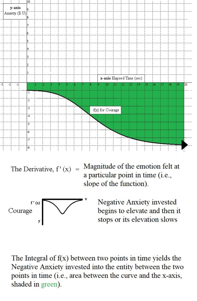 Courage felt for a particular entity as it relates to the fulfillment of a purpose is characterized by an individual’s valuation of the entity initially having a low absolute value (i.e., closer to zero) and being somewhat uncertain before increasing and tapering off again. It is similar to the graph for Fear in this sense, but because Negative Anxiety is used its value descends negatively towards negative infinity before tapering off again. Like for courage, this could be due to the availability of new information concerning a threat of harm to an entity or the inability to prevent the threat of harm (e.g., high efficacy or a low probability of the threat of harm to the entity). If the acquisition of an entity initially seemed unattainable, but new information later suggests that the individual can more easily acquire it, then they would feel emboldened or encouraged to obtain the entity under this model.