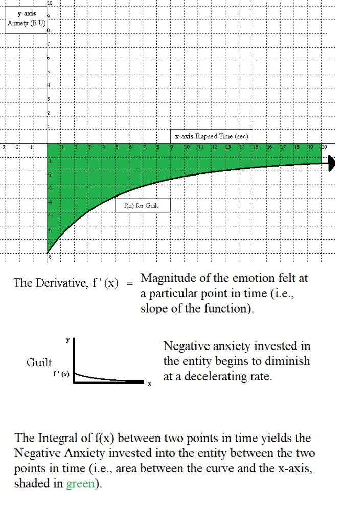 Guilt felt for a particular entity is characterized by an individual’s valuation of the entity initially having a high absolute value, and then rising towards its existential value (i.e., its absolute value diminishes and returns closer towards one in this case). Guilt is modeled as a missed opportunity by an individual in Affect Engineering, and this could arise due to the self initially possessing a good chance or favorable odds to acquire the entity (e.g., high initial efficacy and low threat components), but failing to acquire the entity nonetheless. This often times happens with procrastination for individuals, where they may have initially had time to complete a task, but because they failed to act with urgency, they end up not succeeding.