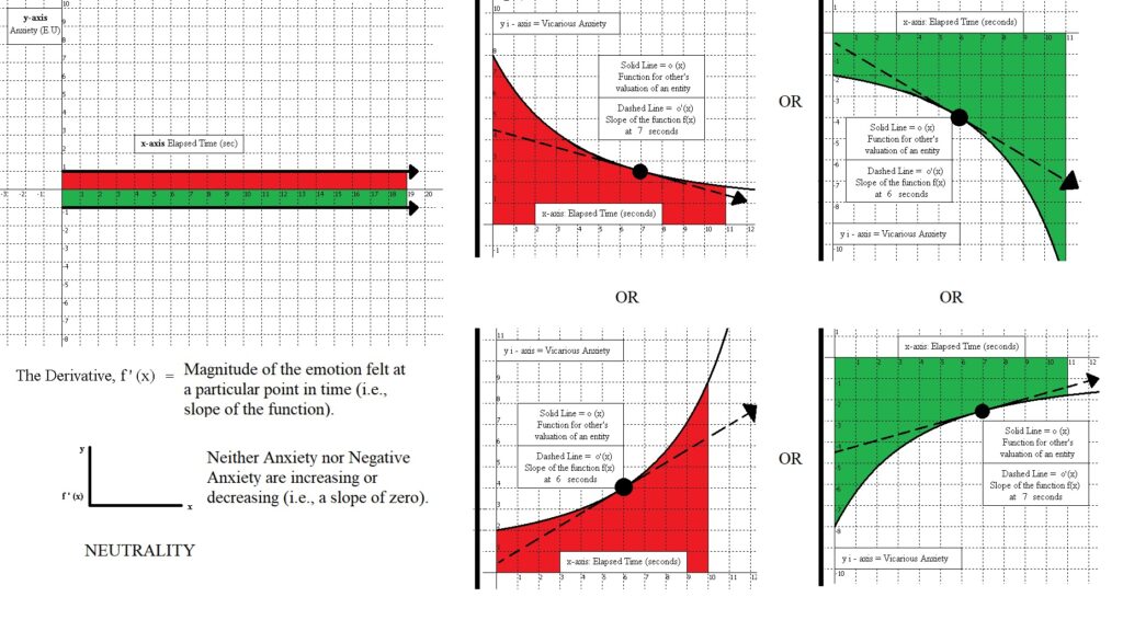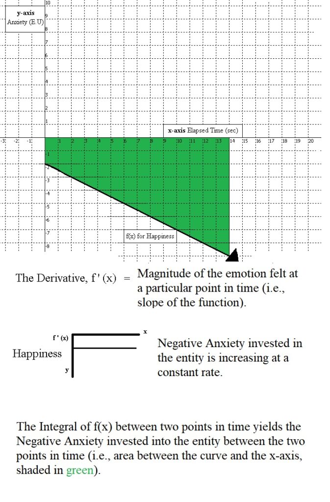 Happiness felt for a particular entity is characterized by an individual’s valuation of the entity descending at a steady rate towards negative infinity. It is important to keep in mind that the negative symbol here (-), for Negative Anxiety, does not symbolize good or bad, but simply means that further acquisition of the entity will lead away from equilibrium between the purpose at hand and its complement or opposing purpose. The entity is already in ample supply, and further acquisition of it is akin to increasing a stockpile of a resource that is already possessed in a sufficient amount. In contrast, for emotions gauged with Anxiety (i.e., Positive Anxiety), the positive Appraisal value implies that acquiring the entity will lead towards a restoration of equilibrium.