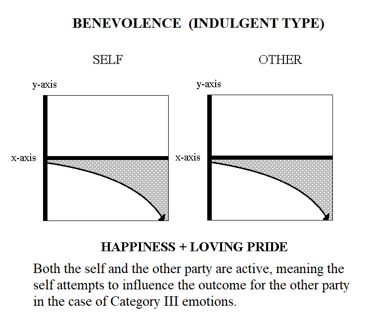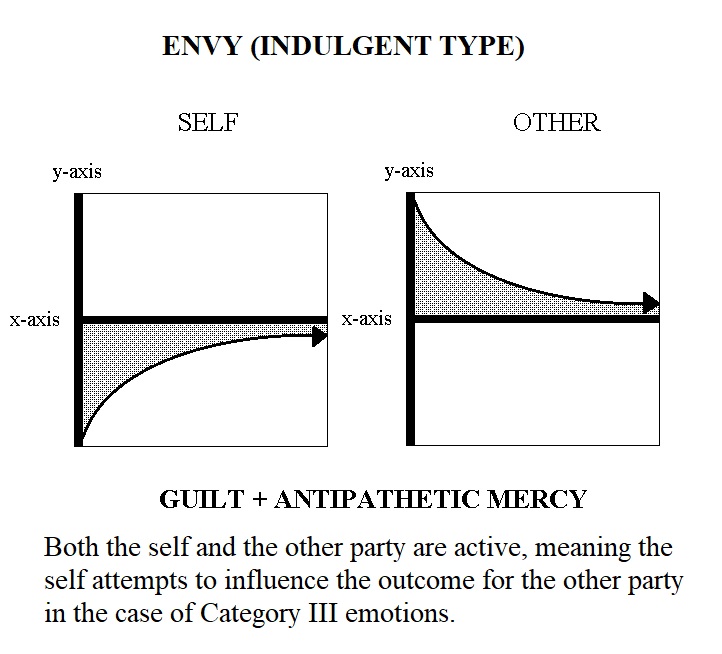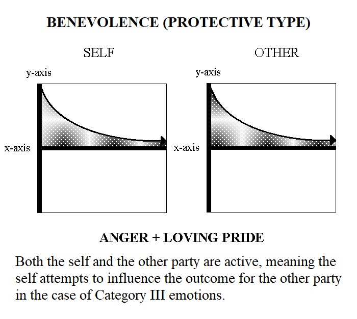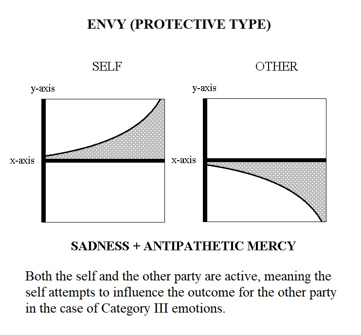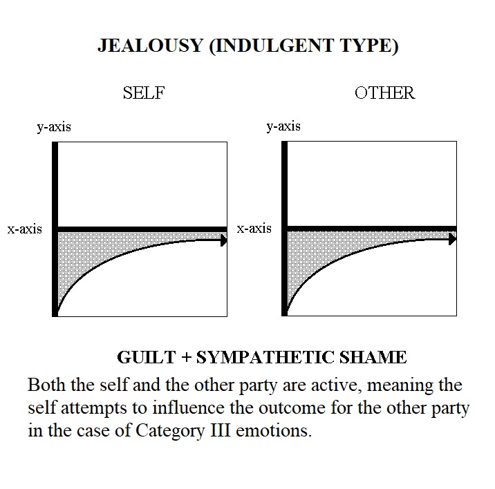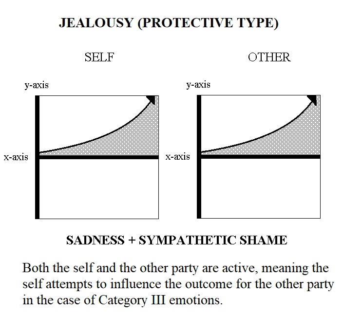 Category III Emotions, the Compound Interactive Emotions, concern the self and others when the empathizing party is actively trying to influence the outcome of the other. They are: Benevolence; Jealousy; Malevolence; Envy. Each of the these four emotions may also be one of two types, Indulgent or Protective. Category III Emotions are comprised of both a Category I and a Category II emotion.