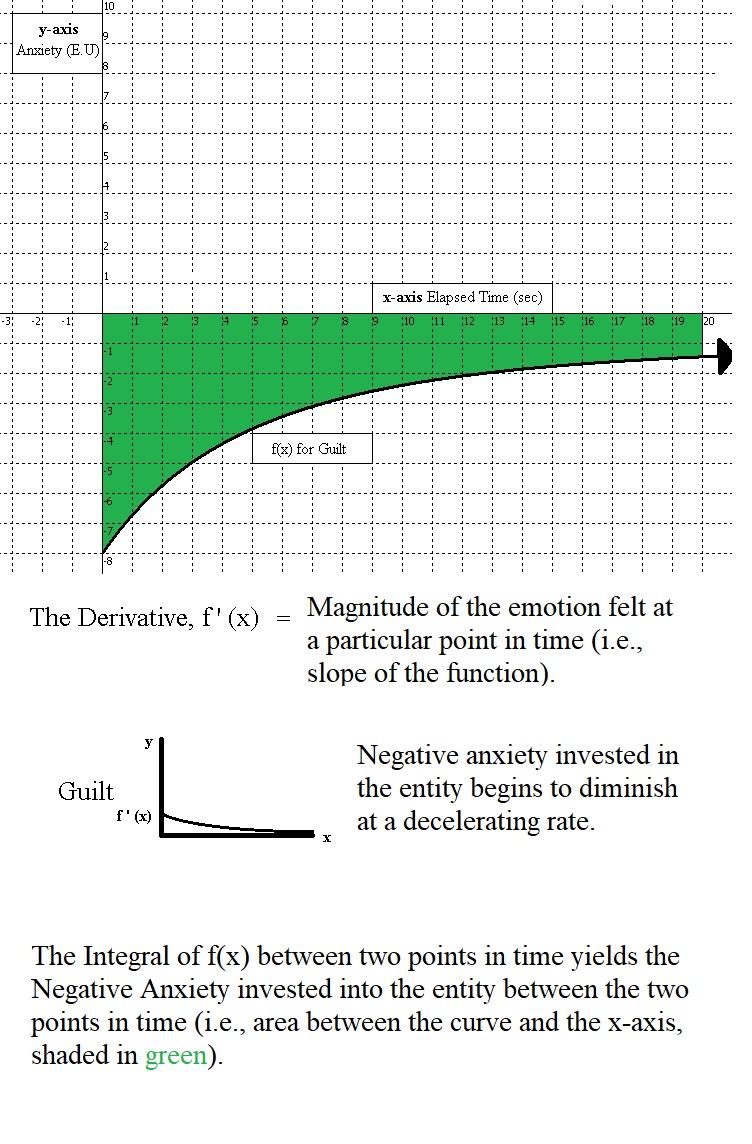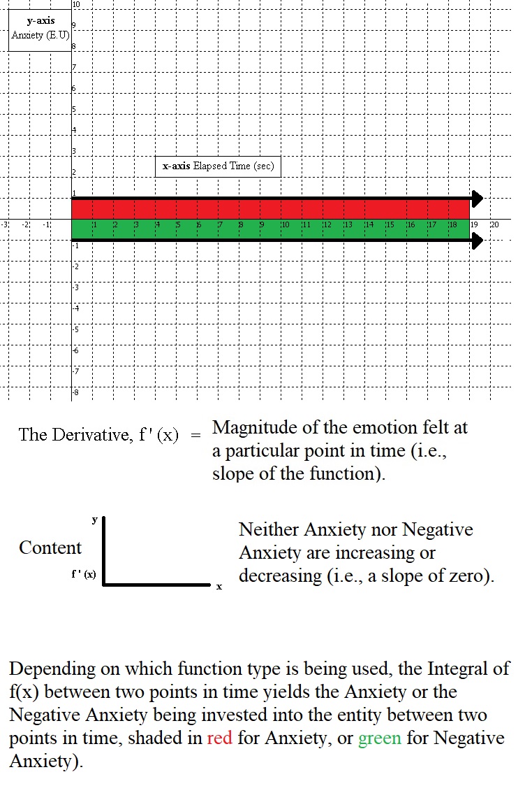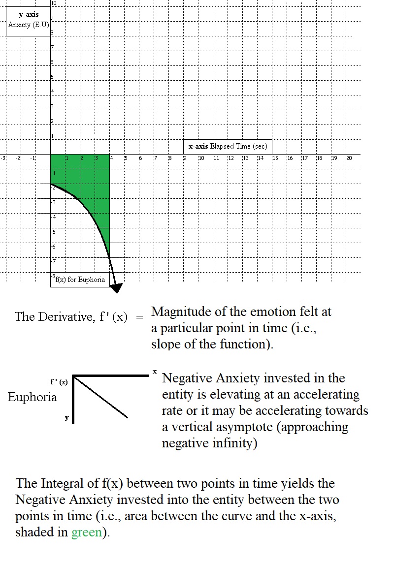 Happiness felt for a particular entity is characterized by an individual’s valuation of the entity descending at a steady rate towards negative infinity. It is important to keep in mind that the negative symbol here (-), for Negative Anxiety, does not symbolize good or bad, but simply means that further acquisition of the entity will lead away from equilibrium between the purpose at hand and its complement or opposing purpose. The entity is already in ample supply, and further acquisition of it is akin to increasing a stockpile of a resource that is already possessed in a sufficient amount. In contrast, for emotions gauged with Anxiety (i.e., Positive Anxiety), the positive Appraisal value implies that acquiring the entity will lead towards a restoration of equilibrium.