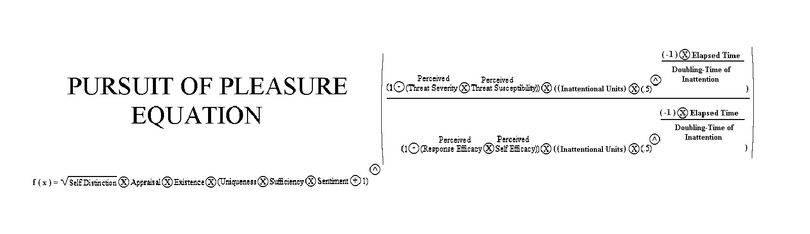 In the remaining articles, each category of emotion will be examined more in depth with either contemporary examples or hypothetical ones. Some of the relationships between variables will also be explored with sample functions comprised of the variables introduced in the first five articles. A sample function for both the Avoidance of Pain and Pursuit of Pleasure equations is provided below.